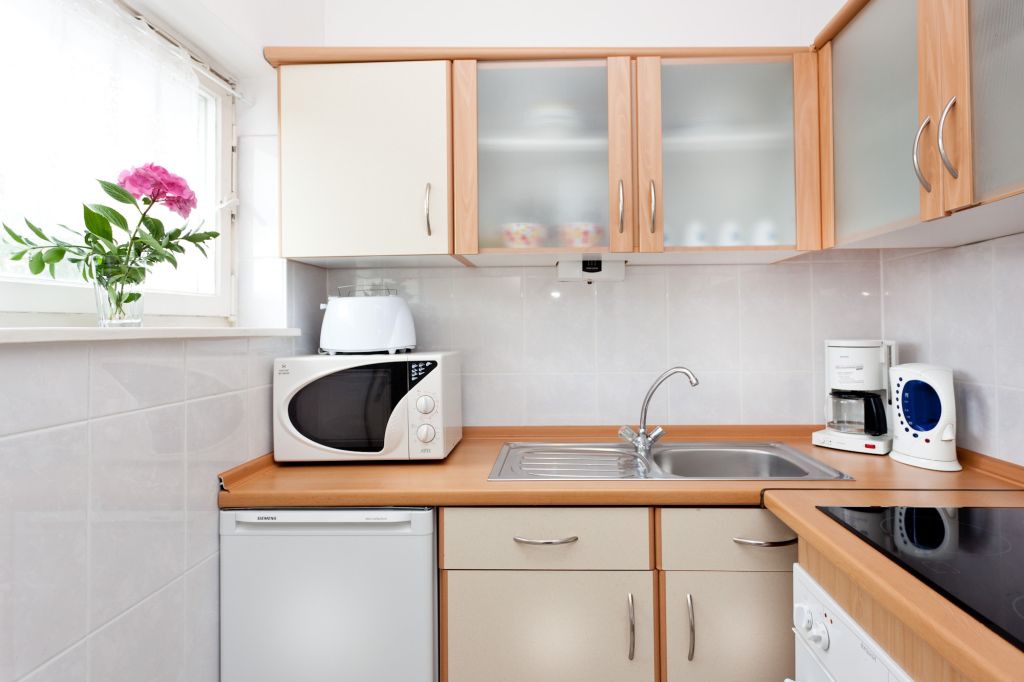 Kühlschrank, Mikrowelle, Bügeleisen, Kaffemaschine, Toaster, Wasserkocher, Besteck, Töpfe und Geschirr sind vorhanden. Das möbilierte Wohn-/Schlafzimmer hat einen Digitalfernsehgerät (70 cm Diagonale), eine Zweiercoch die zu einem Bett (1,50m x 2,00m) ausgeklappt werden kann, ein großes Bett (2,00m x 2,00m) im Wohnbereich, einen Sessel und einen Kleiderschrank.