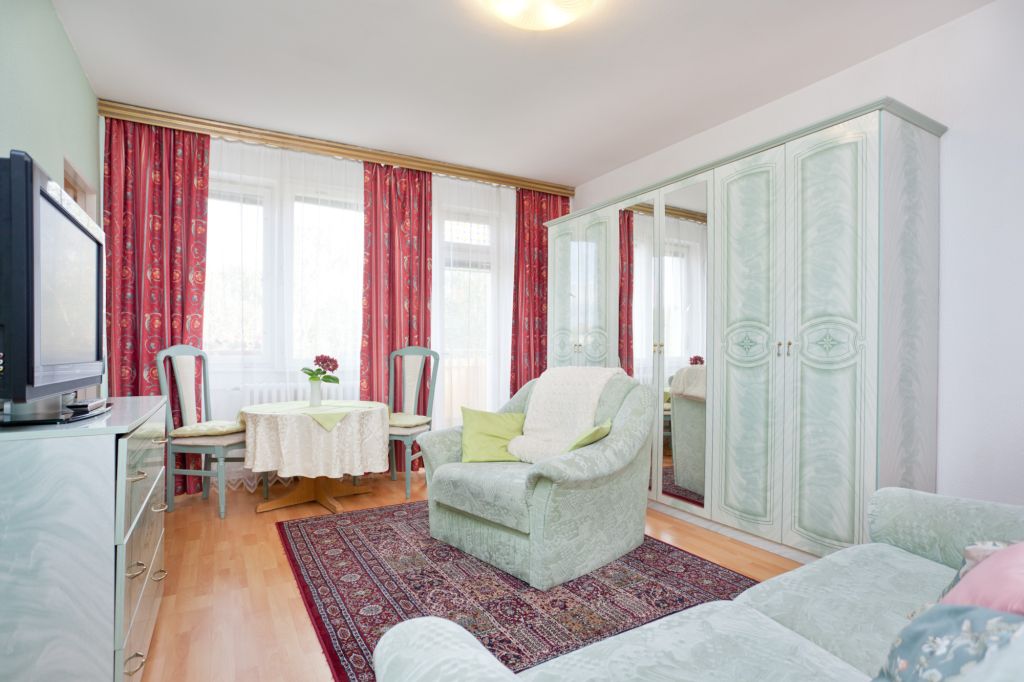 Größe : 40qm 1,5 Zimmer Appartement in der 4.Etage mit Balkon. Die gesamte Wohnung wurde modernisiert und ist jetzt im Topzustand. Das Appartement verfügt über Laminatfußboden und Teppich. Kühlschrank, Bügeleisen, Kaffemaschine, Toaster, Wasserkocher, Besteck, Töpfe und Geschirr sind vorhanden.