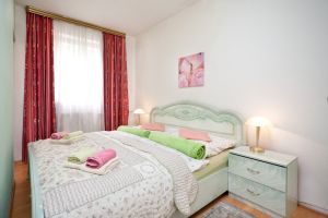 Das Schlafzimmer ist vom möbilierten Wohnbereich durch eine Wand getrennt. Es gibt ein Digitalfernsehgerät (70 cm Diagonale), eine Zweiercoch die zu einem Bett (1,50m x 2,00m) ausgeklappt werden kann. Außerdem gibt es einen Sessel den man zum Bett für eine Person ausklappen kann. Ein Kleiderschrank ist vorhanden.Ein großes Bett (2,00m x 2,00m) befindet sich im Schlafbereich.