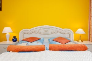 Das Schlafzimmer ist vom möbilierten Wohnbereich durch eine Wand getrennt. Es gibt ein Digitalfernsehgerät (70 cm Diagonale), eine Zweiercoch die zu einem Bett (1,50m x 2,00m) ausgeklappt werden kann. Außerdem gibt es einen Sessel den man zum Bett für eine Person ausklappen kann. Ein Kleiderschrank ist vorhanden.Ein großes Bett (2,00m x 2,00m) befindet sich im Schlafbereich.
