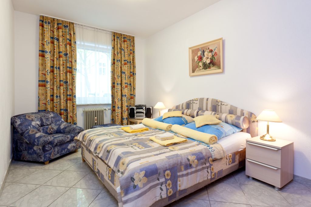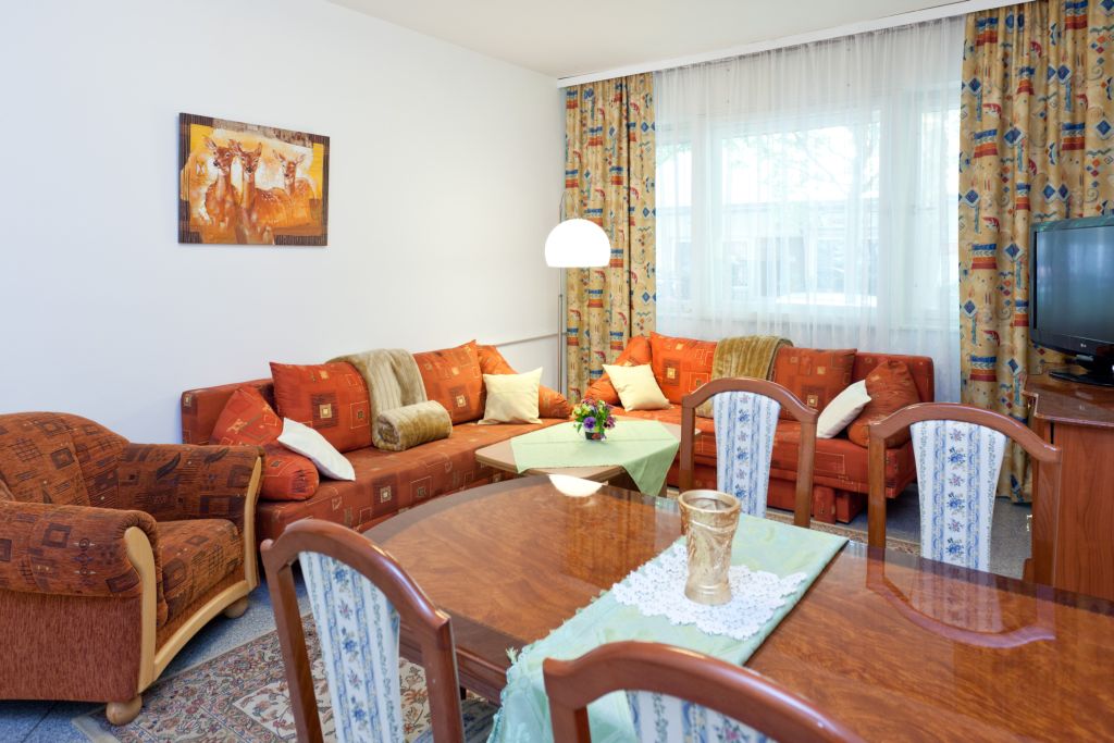 Das möbilierte Wohnzimmer hat ein Digitalfernsehgerät (70 cm Diagonale), einen Esstisch mit 2 Stühlen, einer großen Eckcouch mit ausziehbarer Schlafgelegenheit für 2 Personen und einem extra Sessel. Das Schlafzimmer hat einen großen Einbaukleiderschrank und ein Doppelbett (1,80m X 2,00m). Das Appartement hat außerdem eine Einbauküche.