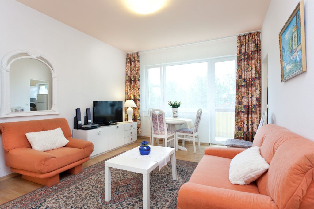 Größe : 36qm 1,5 Zimmer Appartement im 3.OG mit großem Balkon. Die gesamte Wohnung wurde modernisiert und ist jetzt im Topzustand. Das Appartement verfügt über Laminatboden und Teppich. Kühlschrank, Mikrowelle, Bügeleisen, Kaffemaschine, Toaster, Wasserkocher, Besteck, Töpfe und Geschirr sind vorhanden.