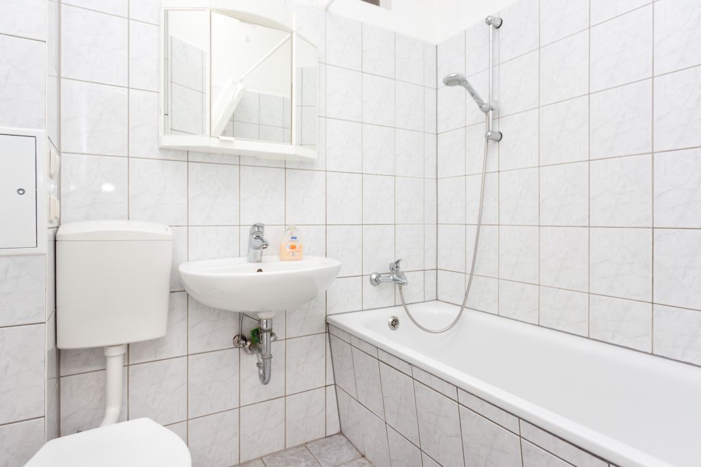 Das Bad hat eine Badewanne und WC. Handtücher und Bettwäsche sind vorhanden. Das Haus hat einen Lift durch den alle Appartements bequem zu erreichen sind.