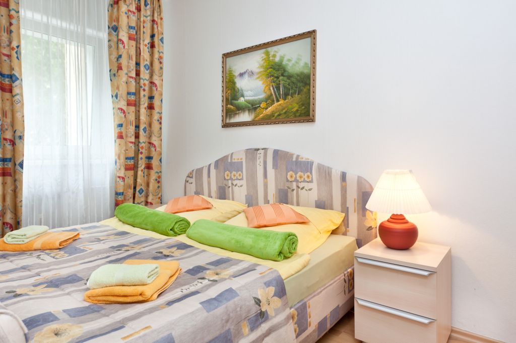 Im Schlafbereich gibt es ein großes Bett (1,60m x 2,00m). Das Bad hat eine Badewanne und WC. Handtücher und Bettwäsche sind vorhanden. Das Haus hat einen Lift durch den alle Appartements bequem zu erreichen sind.